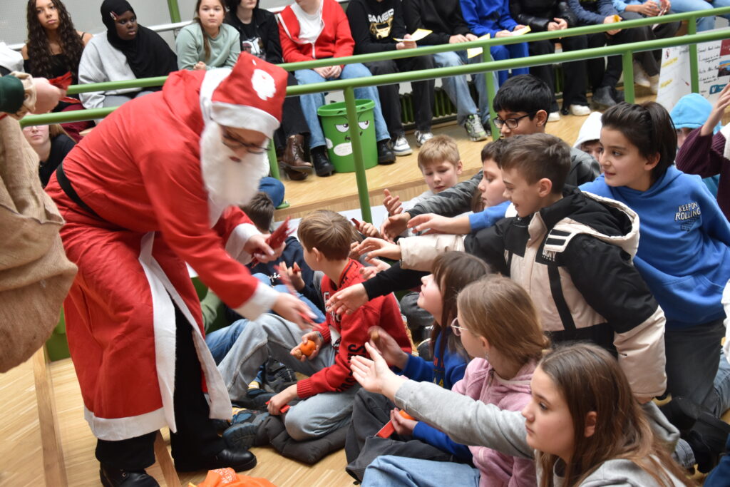 Zum krönenden Abschluss beschenkte der Elternbeirat die Schüler mit Mandarinen und Schokolade. Besonders amüsant war die Verkleidung der Eltern als Nikoläuse, Engel und Grinche, die für viele Lacher sorgte. Währenddessen spielte die Bläserklasse das Weihnachtslied „Morgen kommt der Weihnachtsmann“, was den Auftritt perfekt abrundete.